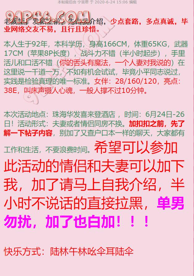 往后的日子会不定期举行活动,但目前只招募情侣或者夫妻,不需要单男。但我作为打桩机也可以作为素质单男,很乐意为众看官们的女伴贡献我的汗水和精液。